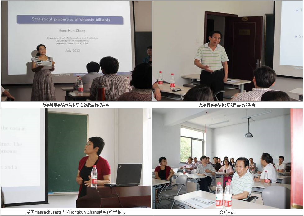 应我校永利23411集团官网邀请,2012年6月31日和8月3日,美国Massachusetts大学Hongkun Zhang教授在我校永利23411集团官网科学讨论班教室做有关动力系统和金融数学方面的学术报告。报告会分别由我校永利23411集团官网副院长李宏教授和永利23411集团官网孙炯教授主持,我校永利23411集团官网的研究生和有关研究方向的教师参加了报告会。