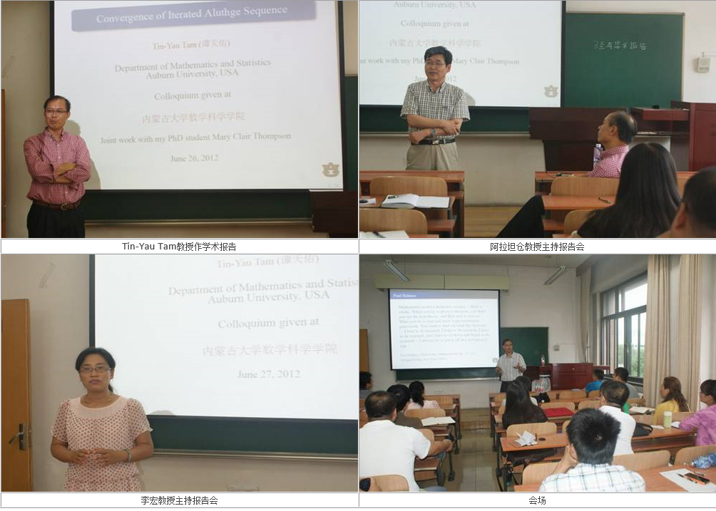 应我校永利23411集团官网邀请,2012年6月26、27日,美国Auburn大学Tin-Yau Tam教授在我校综合楼0212教室作有关矩阵与算子理论的学术报告,并为青年教师和研究生作数学专业学术论文写作的报告,报告会分别由我校教务处处长阿拉坦仓教授、永利23411集团官网副院长李宏教授主持,我校永利23411集团官网的研究生和有关研究方向的教师参加了报告会。