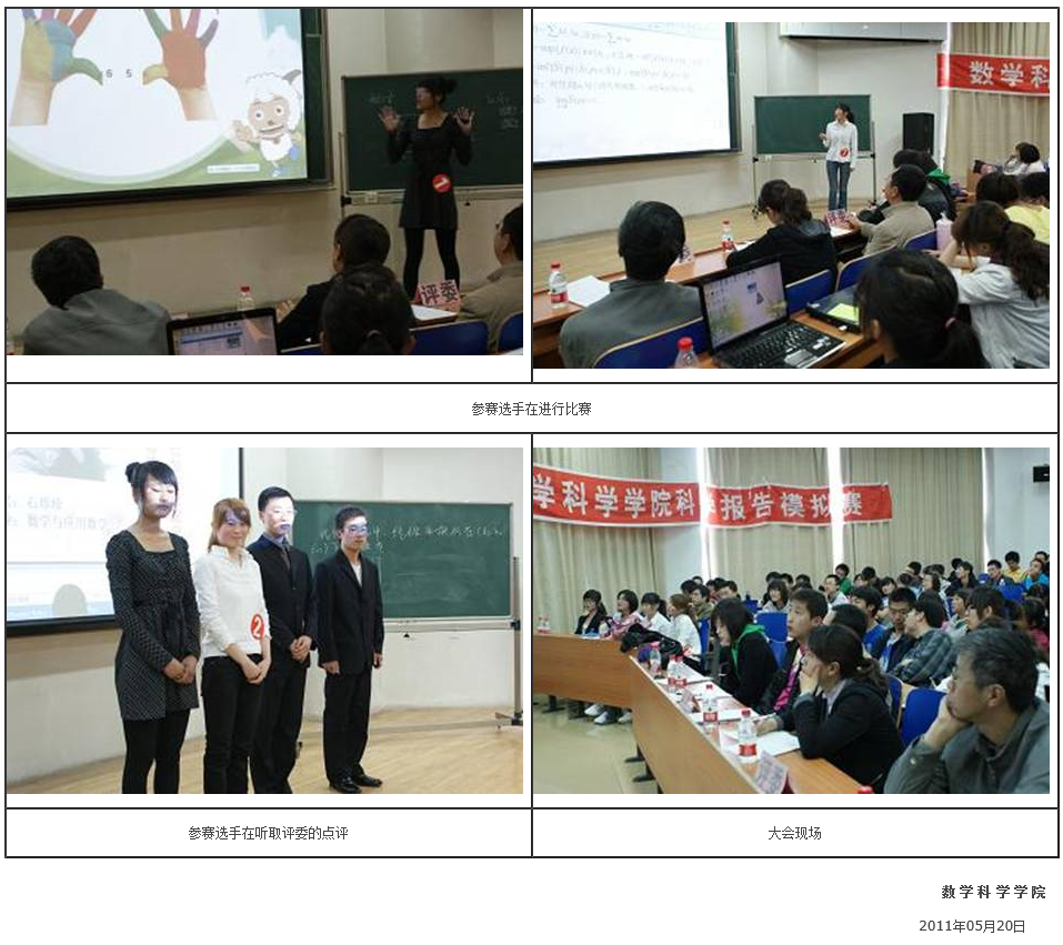 为了增强同学们对数学科学的兴趣,锻炼临场的表达能力,永利23411集团官网团委和学生会在2011年5月份举办了永利23411集团官网永利23411集团官网第三届科技学术报告模拟大赛。大赛分年级进行比赛。2011年5月15日15时,10级的比赛在理工楼阶梯教室四举行。