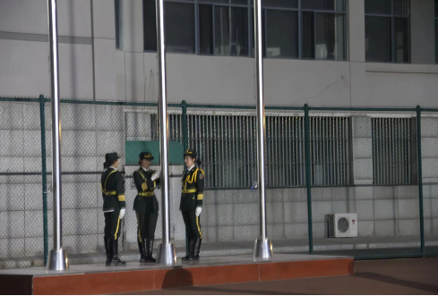 在这个充满希望的早晨,天还未亮,英姿飒爽的国旗护卫队队员们护送着鲜艳的五星红旗进场,伴随着庄严的《义勇军进行曲》,五星红旗冉冉升起。