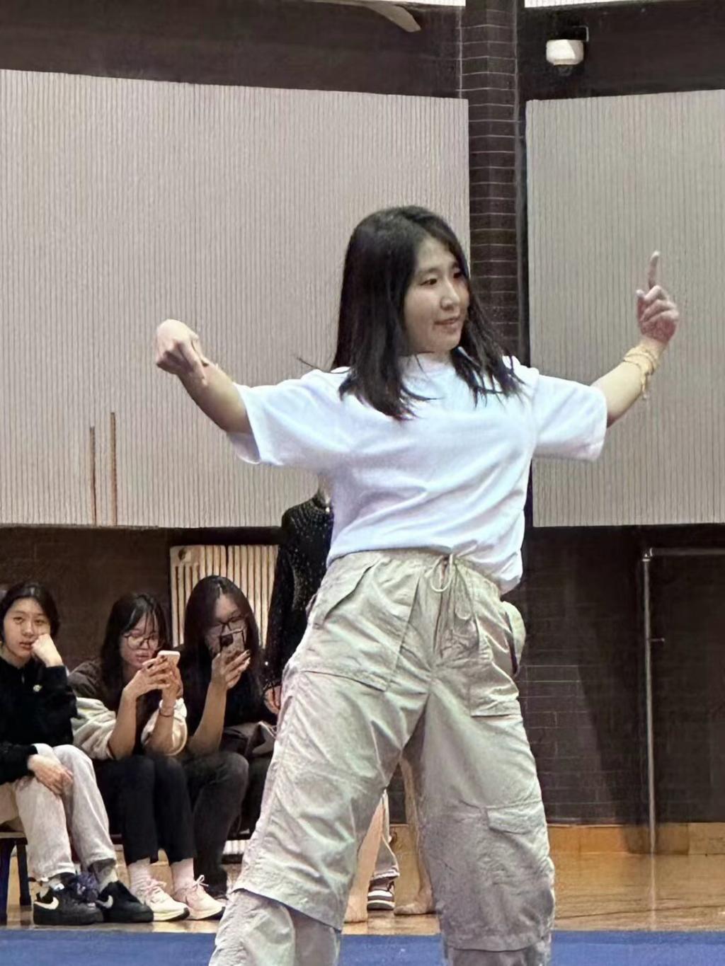 额日古娜同学参加了此比赛,她的肢体随鼓点精准震动,肩胯与节奏共振出利落律动感。她的动作时而快速有力,时而缓慢优雅,与音乐的节拍完美融合。她通过面部表情和身体语言,将街舞的激情、活力和魅力展现的淋漓尽致。